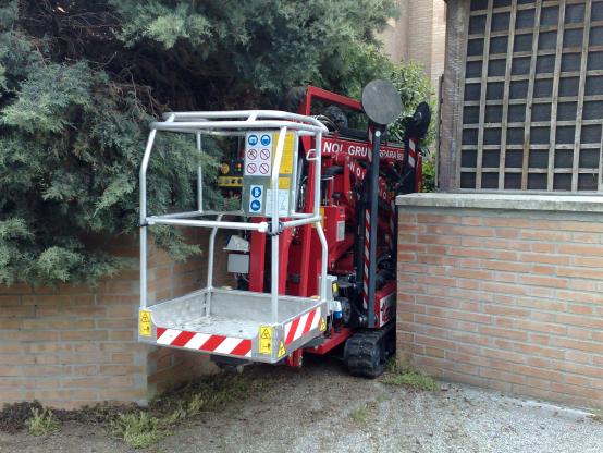 Piattaforma molto compatta, consente l?accesso e la traslazione in cantieri dagli spazi angusti grazie ai ridotti ingombri in larghezza e altezza Cingoli allargabili per la massima stabilit? Motore ausiliario elettrico per interventi all?interno